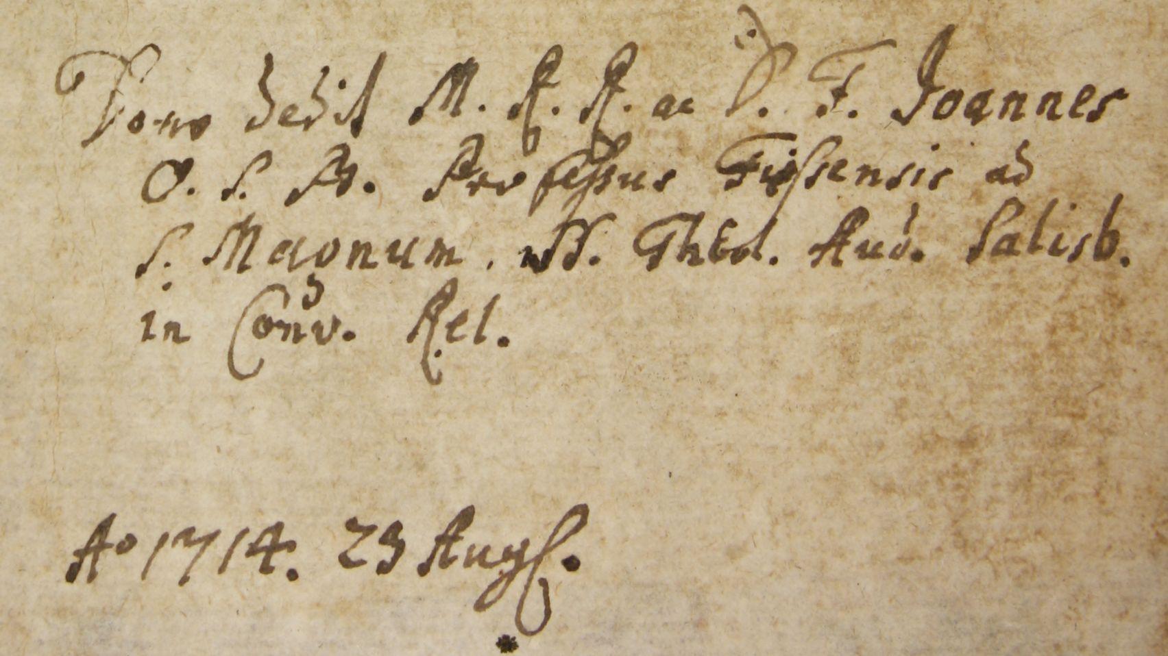 Dono dedit M. R. R. ac. D. F. Joannes O. S. B. Professus Füssenensis ad S. Magnum. SS. Theol. Auc. Salisb. in Conv. Rel. A[nn]o 1714. 23 Aug.