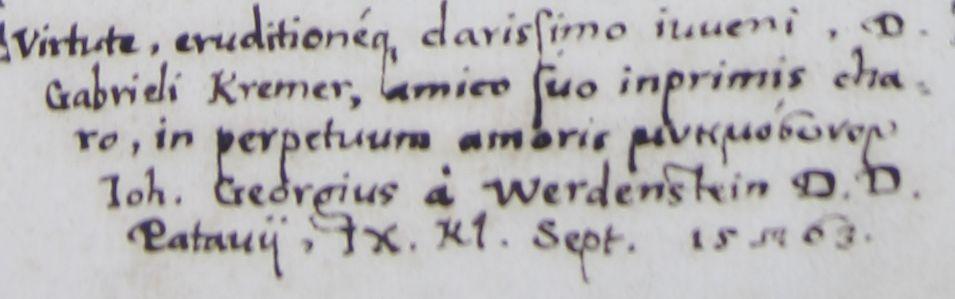 Virtute eruditioneque darissimo iuueri D. Gabrieli Kremer, amico suu inprimis etiaro, in perpetuum amoris [řecký text] Ioh. Georgius a Werdenstein D. D. Pataui IX. K1 Sept. 1563