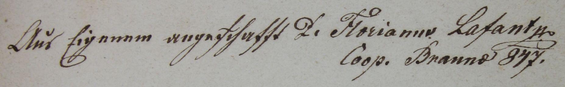 Aus Eigenem angeschafft D. Florianus Lafantus Coop. Braunae [1]847