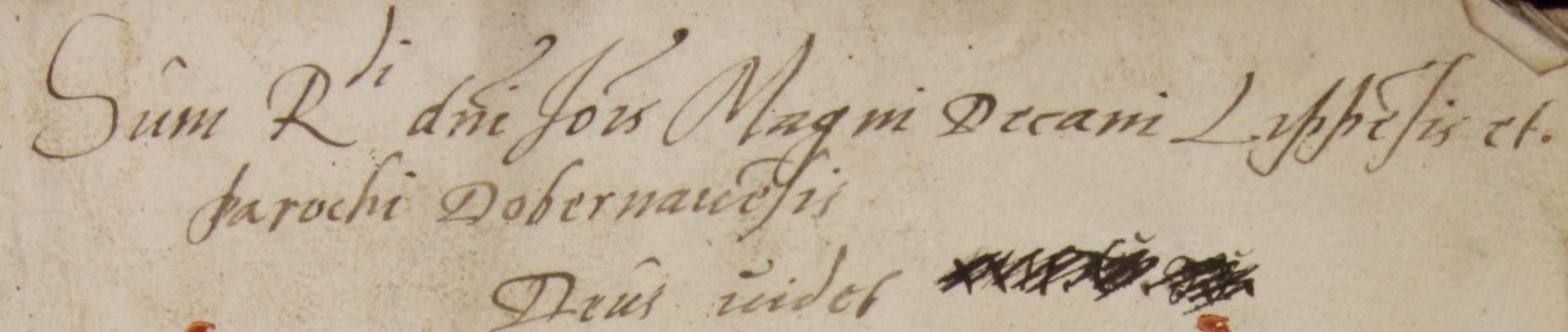 Sum R[everen]di d[omi]ni Jonis Magni Decani Lippesis et. Parochi Dobernauesis Deus videt