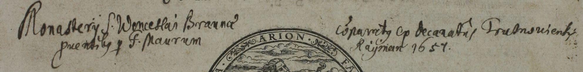 Monasterii S[ancti] Wenceslai Braunae co[m]parat[us] p[ro] decanatus Trutnoviensis p[ro]ventib[us] p[er] F[ratrum] Maurum Rayniem 1657