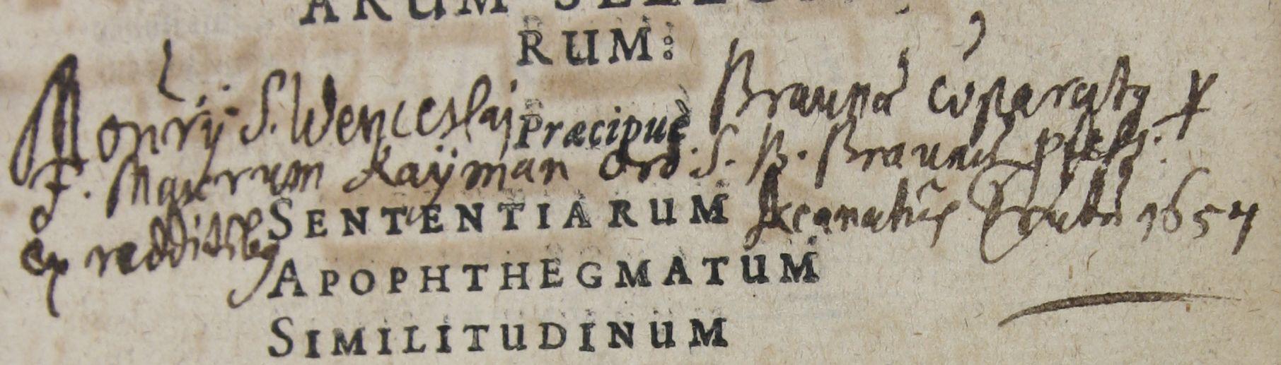 Mon[aste]rij S. Wenceslaj Braunae co[m]parat[us] per F[ratrum] Maurum Raijman ord. S. B. Braunens[is] pr[ofe]ss[us]. ex redditib[us] Decanatus Trutn[oviensis] 1657