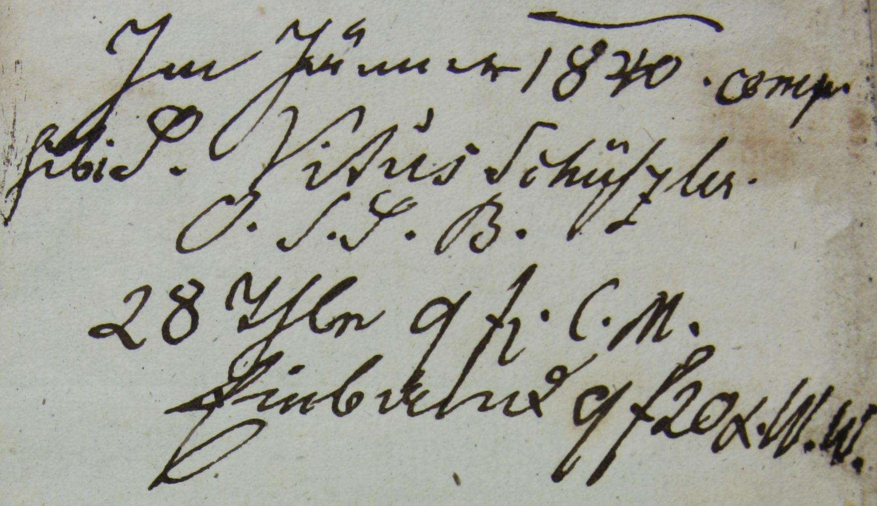 Im Jänner 1840 comp. sibi P. Vitus Schüszler O. I. S. B. 28 Thle 9 fi. C. M. Einband 9 f 20 α. W. W.
